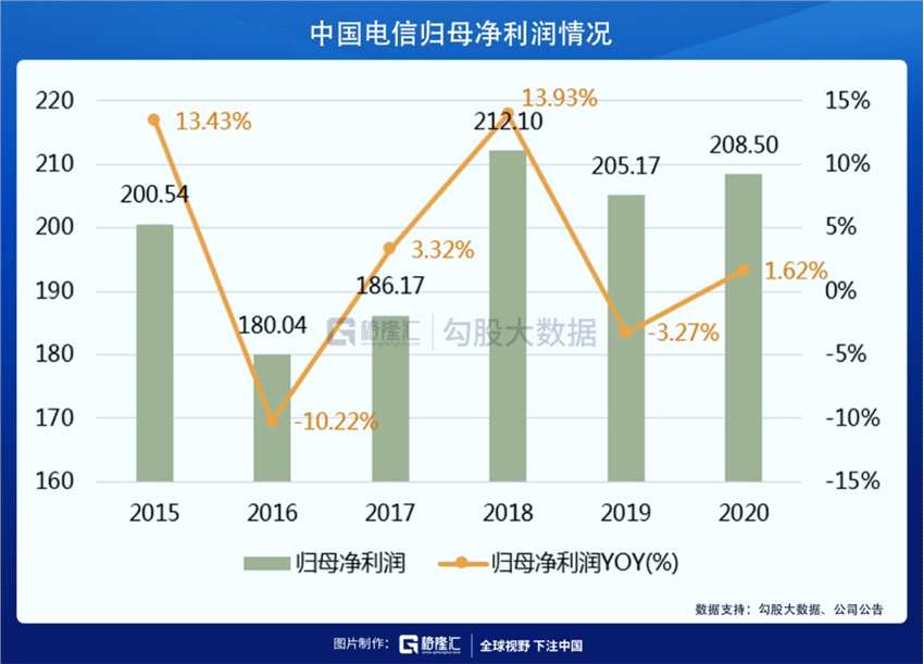 同樣轉(zhuǎn)正的還有利潤端,2020年,中國電信歸母凈利潤為208.5億,同比增長1.6%,去年同期為-3.27%。