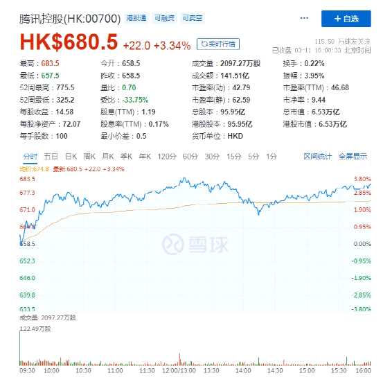 截止3月11日港股收盤,騰訊股價(jià)漲3.34%,報(bào)680.50港元。