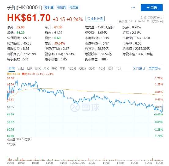 截止3月11日港股收盤,長和股價(jià)漲0.24%,報(bào)61.70港元。