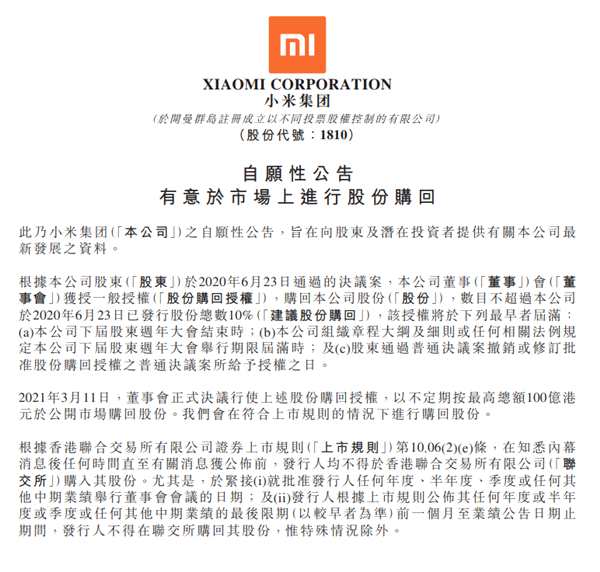 3月11日,小米集團(tuán)發(fā)布公告,宣布董事會(huì)決定行使股份回購(gòu)授權(quán),在禁止買(mǎi)賣(mài)期結(jié)束之后(3月24日),小米將不定期地開(kāi)始在公開(kāi)市場(chǎng)回購(gòu)股份,上限為100億港元。
