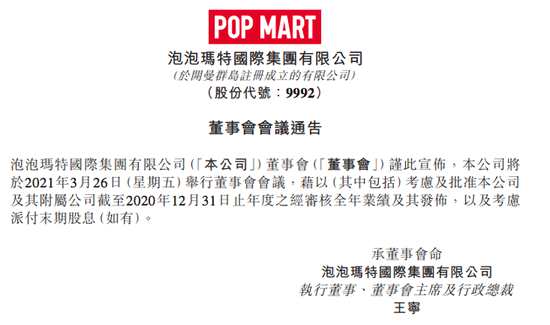 新浪科技訊 3月12日下午消息,泡泡瑪特今日港交所發(fā)布公告稱,本公司董事會謹此宣布,本公司將于2021年3月26日(星期五)舉行董事會會議,借以(其中包括)考慮及批準本公司及其附屬公司截至2020年12月31日止年度之經(jīng)審核全年業(yè)績及其發(fā)布,以及考慮派付末期股息(如有)。