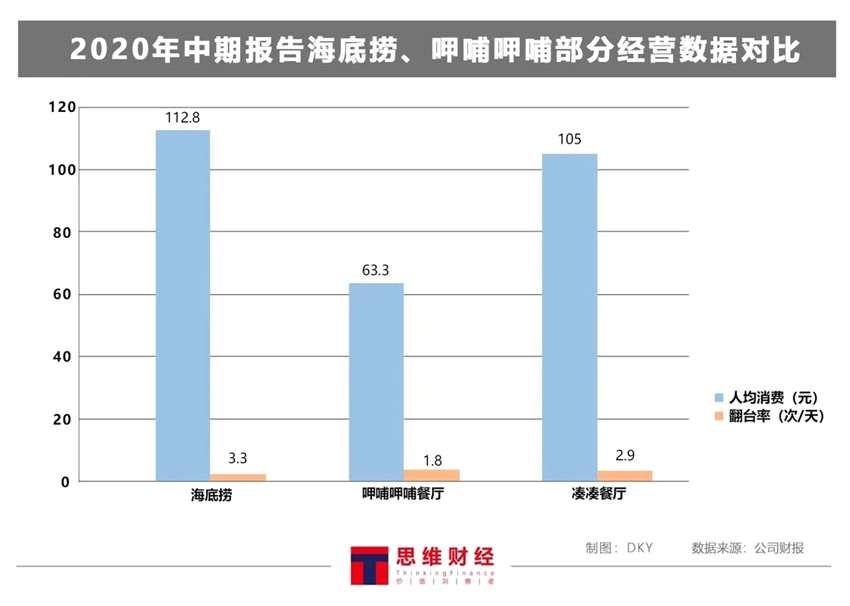 這種差距也表現(xiàn)在他們的經(jīng)營數(shù)據(jù)上。對比兩家火鍋大佬最新發(fā)布的財務報告——2020年中期報告,2020年上半年海底撈的人均消費是112.8元,翻臺率是3.3次/天。同期,呷哺呷哺餐廳的人均消費為63.3元,翻臺率是1.8次/天。同樣隸屬呷哺呷哺,但面對高端客群的湊湊餐廳的人均消費為105元,翻臺率是2.9次/天。在衡量經(jīng)營狀況的重要指標上,呷哺呷哺表現(xiàn)相對遜色。