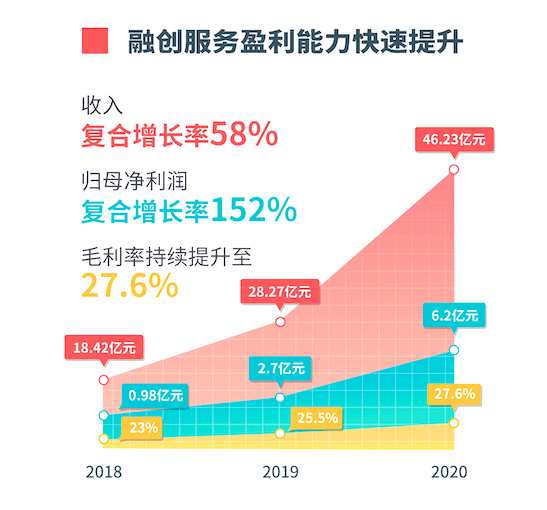 融創(chuàng)服務(wù)業(yè)績(jī)大增。年報(bào)顯示,2020年?duì)I業(yè)收入46.23億元,同比大幅增長(zhǎng)約63.5%,三年復(fù)合增長(zhǎng)率達(dá)58%;歸母凈利潤(rùn)6.20億元,同比大幅增長(zhǎng)約129.6%,三年復(fù)合增長(zhǎng)率達(dá)152%。
