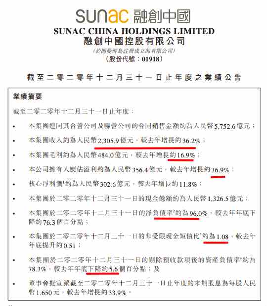 圖為:融創(chuàng)中國(guó)2020年業(yè)績(jī)公告截屏
