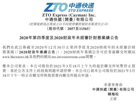 摘要: 3月18日消息,中通快遞發(fā)布公告,公司股份于2021年3月18日上午九時(shí)起于聯(lián)交所短暫停止買賣,基于公告文件上的技術(shù)問題申請(qǐng)停牌。