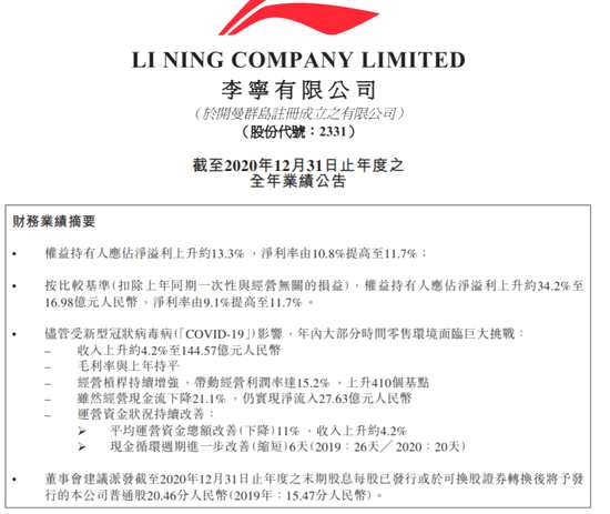 摘要: 李寧公布2020年業(yè)績,該公司實現(xiàn)收入144.57億元人民幣,同比增加4.23%;公司權(quán)益持有人應(yīng)占溢利16.98億元,同比增13.3%;每股基本收益69.21分。