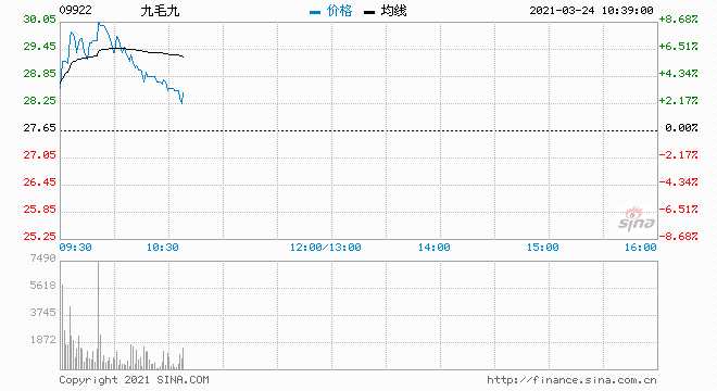 摘要: 九毛九(9922.HK)一度拉升超8%,現(xiàn)報(bào)29.25港元,暫成交1.83億港元,總市值425.12億港元。