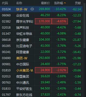 3月24日消息,恒生科技指數(shù)一度跌3%,險守8000點,現(xiàn)跌2.86%??焓值?0%,舜宇光學(xué)跌近5%,美團(tuán)跌近4%,小米跌近3%。