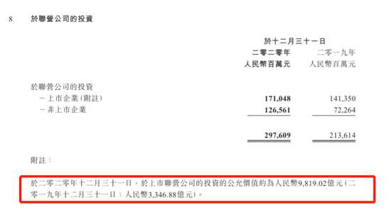 整個2020年,公司投資聯(lián)營公司公允價值從去年底的3347億增加到9819億元,公允價值凈增6472億,相當于第四季度再度增加2400億。