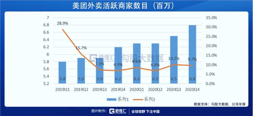 外賣是美團收入貢獻的主要板塊,馬路上一個個勤勞的黃色小馬甲,也是美團鏈接百萬商家和消費者的重要紐帶。在2020疫情肆虐之下,外賣業(yè)務的收入雖然短期受到了沖擊,但是背后的社會價值可能遠超其經(jīng)濟價值,而依靠龐大的騎手團隊,美團未來的“連接”價值無可限量。而數(shù)據(jù)也印證了這一點,商家數(shù)目繼續(xù)增長9.7%至680萬家,用戶數(shù)大幅增長7.1%至歷史新高的5.1億。