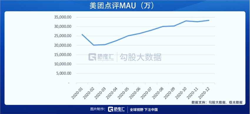 根據(jù)極光的數(shù)據(jù),美團點評的MAU在2020年也是持續(xù)上升,從疫情最嚴重的2億月活上升到了年末的3.3億月活,增長十分明顯,連接商家和用戶的能力也在逐步提升。而且在到店領域,美團已經(jīng)實現(xiàn)了絕對的領先。