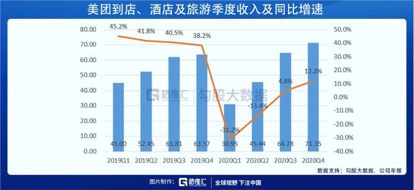 第二個板塊是到店、酒店及旅游,第四季度收入71.35億,同比增速也緩慢恢復到了12.2%,要知道,2020全年疫情基本都在反復。