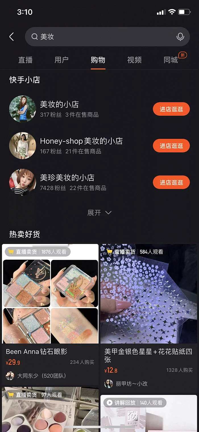 但目前的快手,在有意以產(chǎn)品為中心。在快手的搜索欄中,商品搜索結(jié)果后,點(diǎn)擊“購物”,分為了“快手小店”和“熱賣好貨”兩部分。這種以產(chǎn)品為中心的策略,很大程度上會稀釋對主播的關(guān)注度,讓用戶的注意力回歸到購買本身。