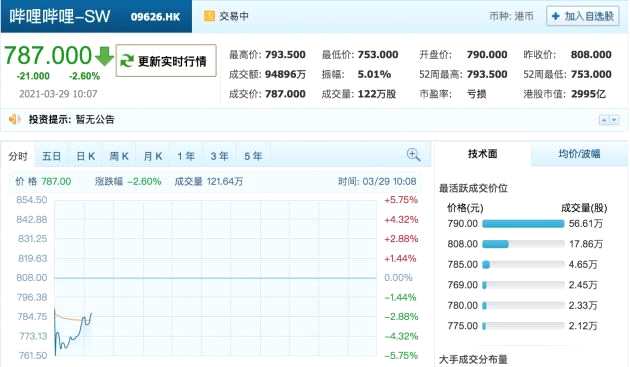 【TechWeb】3月29日消息,嗶哩嗶哩(簡稱B站)今日正式在港交所掛牌上市,開盤價790港元,較發(fā)行價808港元下跌2.23%。截至發(fā)稿,b站股價787港元,市值2995億港元。