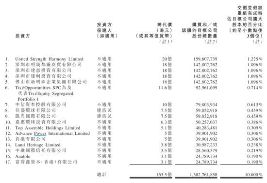 中國恒大在港交所公告稱,深圳市明晟都靈商貿(mào)有限公司、中信資本控股有限公司等17家投資方擬合計163.5億港元投資目標公司(持有房車寶80.8%權(quán)益)。其中,將以81.75億港元購買6.5億股目標公司現(xiàn)有股份,同時以81.75億港元認購6.5億股新發(fā)行股份。