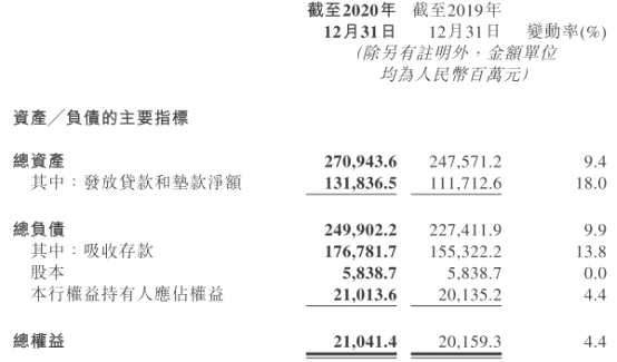 截至2020年末,晉商銀行的資產(chǎn)總額為2709.44億元,同比增長9.4%,其中發(fā)放貸款和墊款凈額為1318.37億元,同比增長18.0%;負債總額為2499.02億元,同比增長9.9%,其中吸收存款1767.82億元,同比增長13.8%。