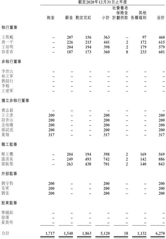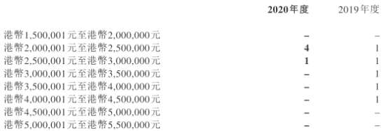 另外,2020年度,晉商銀行五位酬金最高人士的酬金在港幣200萬元至港幣250萬元的有4人,在港幣250萬元至港幣300萬元的有1人。
