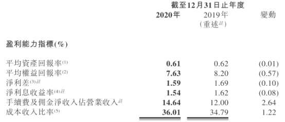 2020年,晉商銀行平均資產(chǎn)回報率0.61%,較上年同期下降0.01個百分點;平均權益回報率為7.63%,較上年同期下降0.57個百分點;凈利差為1.59%,較上年同期下降0.10個百分點;凈利息收益率為1.54%,較上年同期下降0.08個百分點。