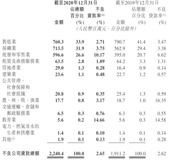 按行業(yè)劃分的貸款及不良貸款分布情況顯示,公司貸款中,批發(fā)和零售業(yè)不良貸款余額、不良貸款率上升多。2020年末,晉商銀行批發(fā)和零售業(yè)不良貸款金額為5.97億元,上年末為3.95億元;批發(fā)和零售業(yè)不良貸款率10.17%,上年末為6.62%。