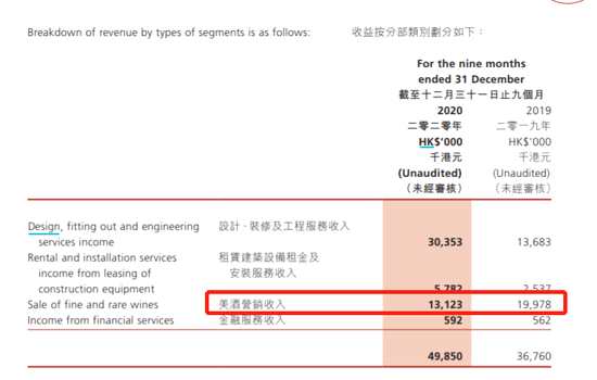 本集團(tuán)主要從事(i)提供裝修及工 程、設(shè)計及采購家具及相關(guān)產(chǎn)品服務(wù),(ii) 租賃建筑設(shè)備,(iii)美酒營銷,以及(iv)提供金融服務(wù)。2020年前9個月,公司美酒營銷實現(xiàn)收入1312萬港元,錄得大幅下滑。