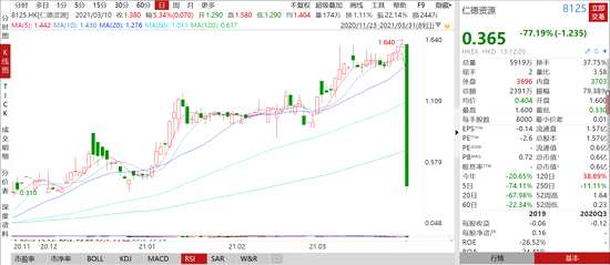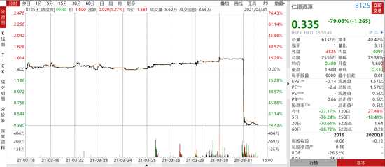 摘要: 3月31日消息,港股仁德資源今日閃崩暴跌近80%,截至發(fā)稿,仁德資源跌77%,市值只有0.6億港元,放量成交近6000萬股。