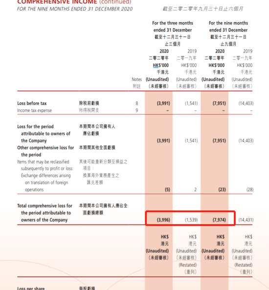 今年2月8日,仁德資源(08125)公布截至2020年12月31日止9個月業(yè)績,實現(xiàn)收益4985萬港元,同比增長約35.6%;凈虧損795.1萬港元,同比下降約44.4%;每股虧損0.12港元,不派息。