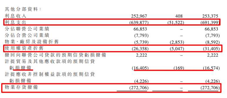 此外,年報(bào)顯示,期內(nèi),其部分收益,利息支出6.91、合營公司虧損7793萬元、 使用權(quán)資產(chǎn)折舊3141萬元、計(jì)提貿(mào)易及其他應(yīng)收款項(xiàng)的預(yù)期信貸虧損撥備1657萬元,物業(yè)存貨撥備累計(jì)2.73億元。