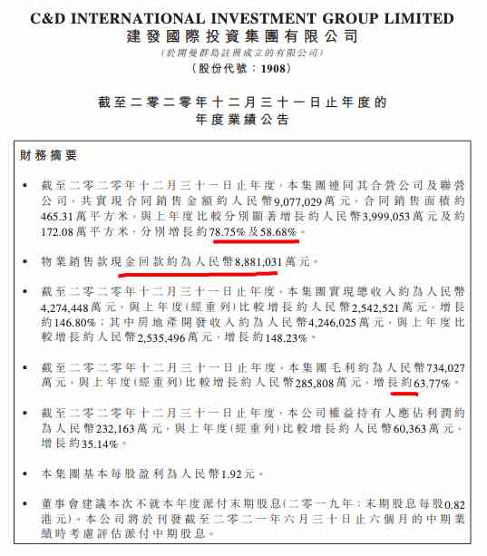 年報(bào)顯示,2020年,集團(tuán)連同其合營公司及聯(lián)營公司,共實(shí)現(xiàn)合同銷售金額約人民幣907.7億元,合同銷售面積約465.31萬平方米,與上年度比較分別增長約人民幣399.9億元及約172.08萬平方米,分別增長約78.75%及58.68%。物業(yè)銷售款現(xiàn)金回款約為人民幣888.1億元。