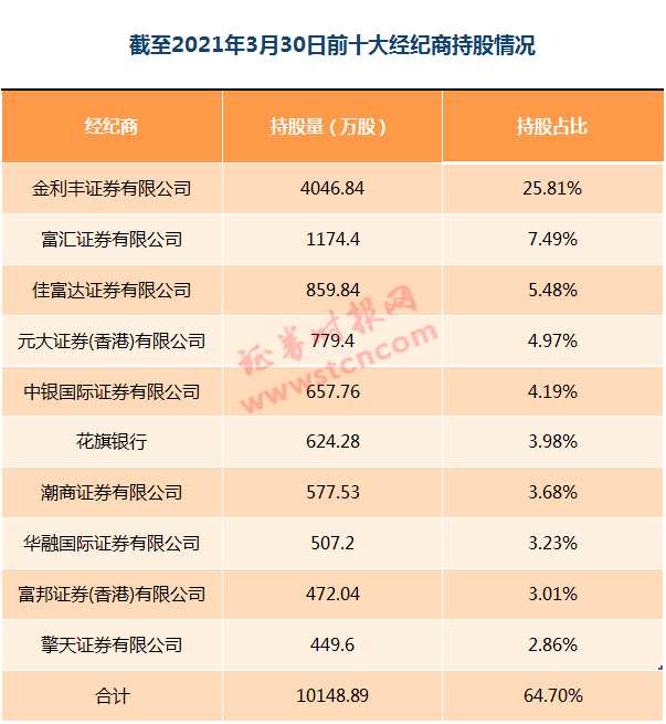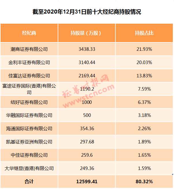 其中,潮商證券有限公司持股由2020年年底的3438.33萬股減少至577.53萬股,持股占比由21.93%降至3.68%;金利豐證券有限公司持股由2020年年底的3140.44萬股增加至4046.84萬股,持股占比由20.03%提升至25.81%;佳富達證券有限公司持股由2020年年底的2169.44萬股減少至859.84 萬股,持股占比由13.83%降至5.48%。