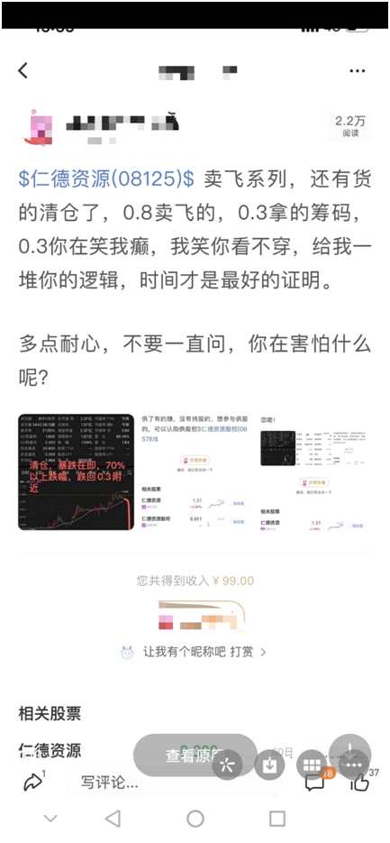 在仁德資源股票社區(qū),記者也看到有部分投資者公布其操作記錄,其粉絲量超過1.1萬人,不排除有部分股民跟隨操作出現(xiàn)巨虧。