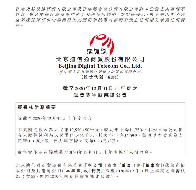 摘要: 中國網(wǎng)科技4月1日訊迪信通(06188)發(fā)布2020年年度業(yè)績,業(yè)績報告顯示,2020年迪信通集團的收入135.5億元,較去年下降11.73%。凈利潤為1.14億元,較去年下降55.69%。