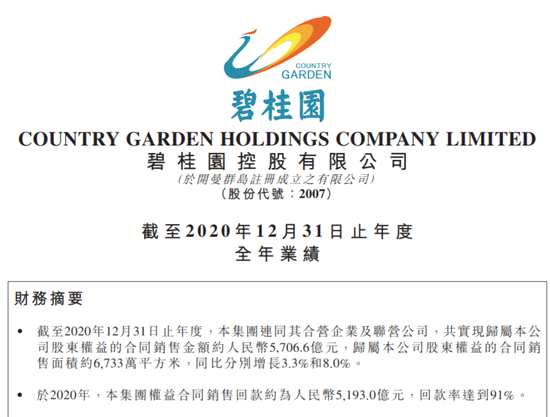 2020年全年碧桂園實現(xiàn)合約銷售額5706.6億元 同比增長3.3%