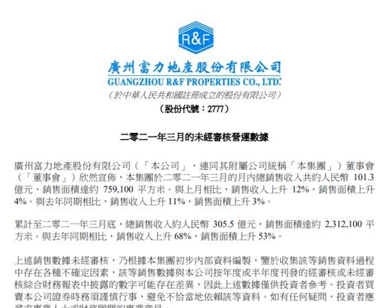 摘要: 富力地產(02777.HK)發(fā)布公告,本集團于2021年3月的月內總銷售收入共約人民幣101.3億元,銷售面積達約759100平方米。與上月相比,銷售收入上升12%,銷售面積上升4%。