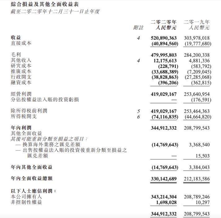 財報數(shù)據(jù)顯示,2020年,公司營業(yè)收入5.21億元,同比增長71.36%;歸母凈利潤3.43億元,同比增長64.38%;董事會建議派付末期股息每股0.05208港元。