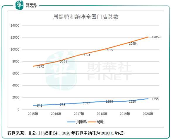 在門店的擴(kuò)張上,直營(yíng)模式存在的劣勢(shì)尤為明顯。下圖顯示,兩種經(jīng)營(yíng)模式的周黑鴨和絕味擁有的門店數(shù)量差距不斷拉大。2020年上半年,絕味門店總數(shù)高達(dá)1.2萬(wàn)間,而周黑鴨門店總數(shù)僅為1755間,僅為絕味的14.6%。