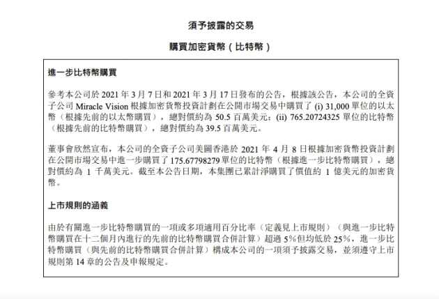截至本公告日期,本集團已累計凈購買了價值約1億美元的加密貨幣。