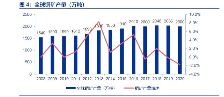 2020年全球銅礦產(chǎn)量同比下滑1.8%:根據(jù)ICSG數(shù)據(jù)統(tǒng)計(jì),2020年全球銅礦產(chǎn)量2000萬噸,同比2019年下滑1.8%,產(chǎn)量下降主要由于疫情導(dǎo)致礦山主產(chǎn)區(qū)生產(chǎn)運(yùn)輸受到影響。
