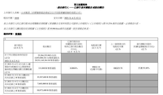 新浪科技訊 4月12日晚間消息,小米集團(tuán)在港交所公告稱,今日回購(gòu)199.7萬股,耗資4.99億港元。