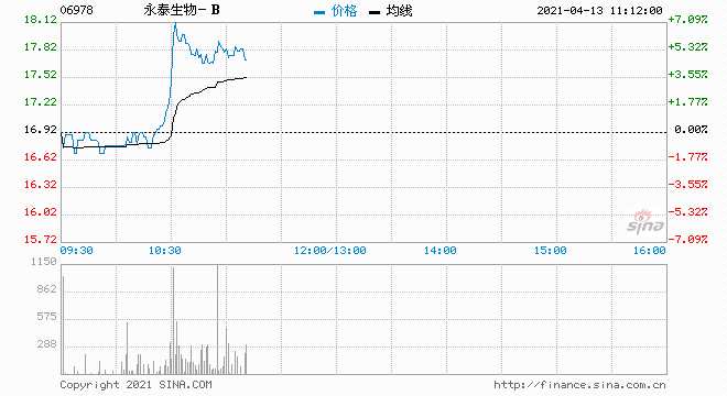 永泰生物-B(06978)早盤急升逾6%,截至發(fā)稿,漲6.38%,報18港元,成交額1191.22萬港元。