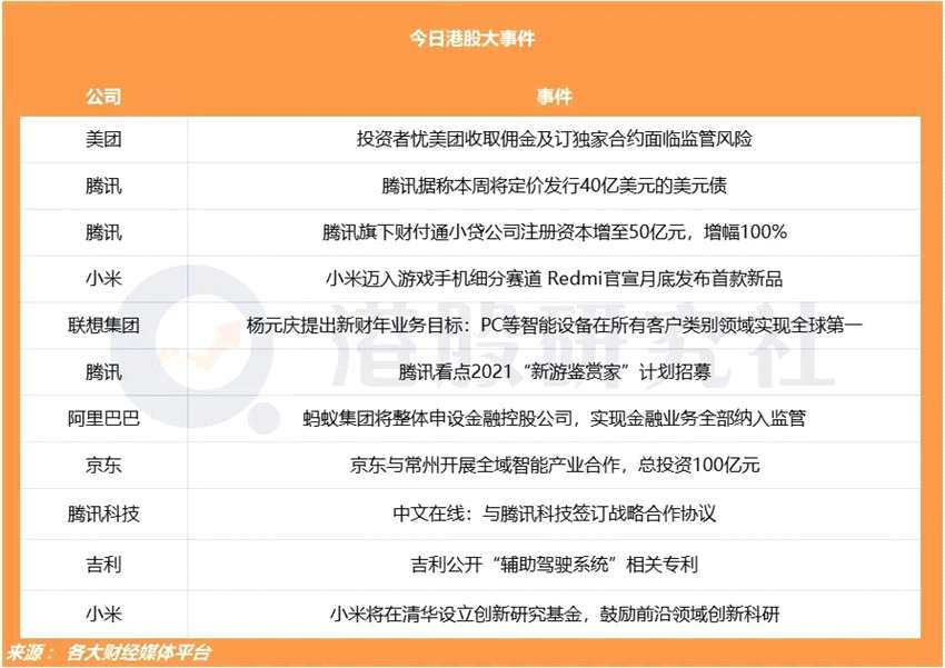 摘要: 研究社日報(bào)重點(diǎn)關(guān)注:瑞信:投資者憂美團(tuán)收取傭金及訂獨(dú)家合約面臨監(jiān)管風(fēng)險(xiǎn);騰訊據(jù)稱本周將定價(jià)發(fā)行40億美元的美元債;京東與常州開展全域智能產(chǎn)業(yè)合作,總投資100億元。