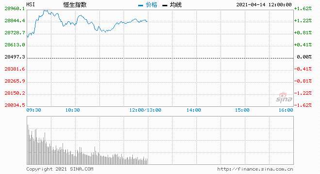 4月14日消息,美股周二收盤漲跌不一,標(biāo)普500指數(shù)創(chuàng)盤中與收盤歷史新高。今日開盤,恒生指數(shù)高開1.05%,截至午間收盤,恒生指數(shù)漲1.24%,報(bào)28850點(diǎn);國企指數(shù)漲1.35%,紅籌指數(shù)漲0.72%。