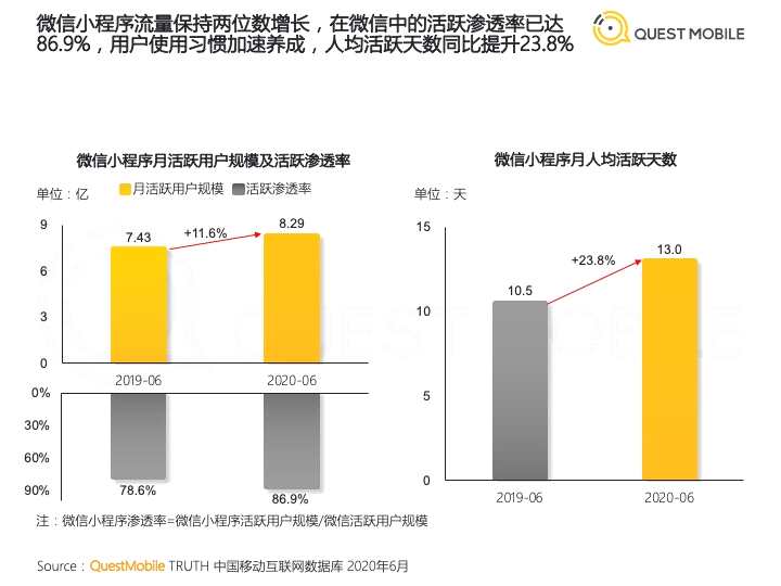 另一方面,根據(jù)QuestMobile發(fā)布的《2020年微信小程序半年報告》顯示。截至2020年6月,微信小程序流量始終保持兩位數(shù)增長,月覆蓋用戶規(guī)模已經(jīng)達(dá)到8.3億,相比去年增長了11.6%,月活用戶規(guī)模百萬以上小程序已經(jīng)突破1000個,用戶人均使用個數(shù)也增加到了9.8個,人均活躍天數(shù)同比提升23.8%。