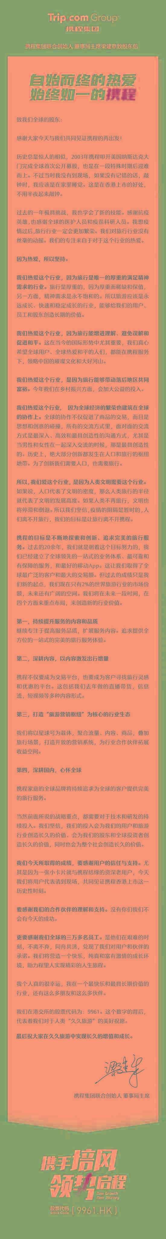 摘要: 攜程集團聯(lián)合創(chuàng)始人、董事局主席梁建章發(fā)布致股東信,他表示,“感謝大家今天來見證攜程的再出發(fā),我覺得在香港上市有個好處,就是可以不用放棄睡覺就可以來敲鐘。
