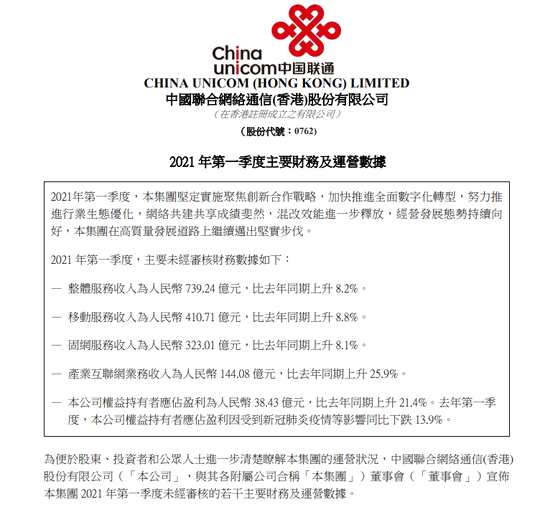 中國(guó)聯(lián)通:一季度權(quán)益持有者應(yīng)占盈利同比上升21.4%