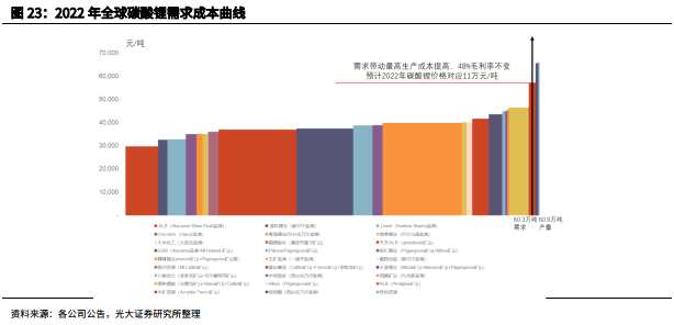 2023年全球碳酸鋰供需開始反轉(zhuǎn),供需缺口開始擴大,行業(yè)盈利能力將進一步提升,假設(shè)行業(yè)最低毛利率仍按48%計算,我們預(yù)計2023年碳酸鋰中樞價格將高于12.8萬元/噸。