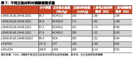 (3)根據(jù)不同種類正極材料實際克容量測算,三元電池對碳酸鋰需求約為1.0Kg/Kwh;磷酸鐵鋰電池對碳酸鋰需求約為0.8Kg/Kwh;錳酸鋰電池對碳酸鋰需求約為0.9Kg/Kwh。