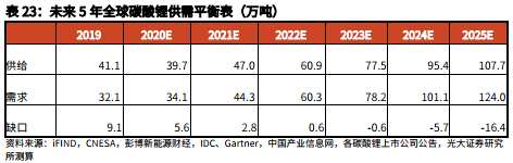 供給端:預(yù)計2025年全球碳酸鋰產(chǎn)量108萬噸,缺口13%