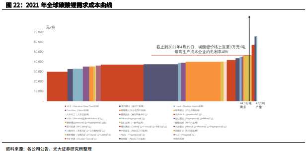 根據(jù)成本曲線,2021年全球碳酸鋰需求44.3萬噸,對應(yīng)釋放產(chǎn)能的最高生產(chǎn)成本約4.6萬元/噸,截止到2021年4月19日,電池級碳酸鋰價格已突破9萬元/噸,對應(yīng)行業(yè)最低毛利率約為48%。