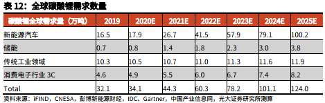 綜上所述,預(yù)計2025年全球碳酸鋰總需求可達到124萬噸,是2020年的3.6倍。