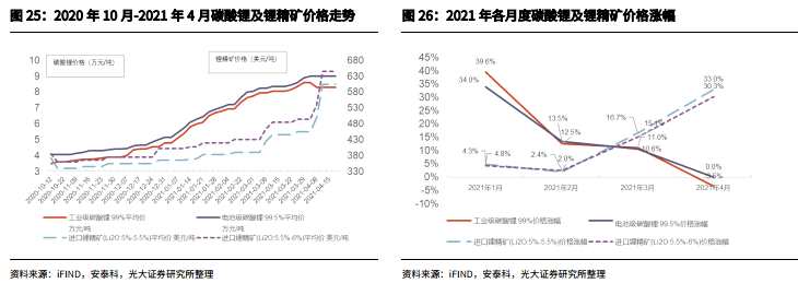 碳酸鋰價格自2020年四季度開始反轉(zhuǎn),根據(jù)安泰科數(shù)據(jù),截止到2021年4月19日,國內(nèi)工業(yè)級碳酸鋰均價8.3萬元/噸;國內(nèi)電池級碳酸鋰均價9萬元/噸。近5個月內(nèi),工業(yè)級碳酸鋰漲幅達到137%;電池級碳酸鋰漲幅達到122%。鋰鹽價格的快速提升也逐漸傳導(dǎo)至上游鋰精礦。截止到2021年4月19日,5%-6%氧化鋰鋰精礦平均進口價格達到605-645美元/噸,為近20個月的新高值,自2021年3月開始,鋰精礦價格單月漲幅超過碳酸鋰價格單月漲幅實現(xiàn)反轉(zhuǎn),進口鋰精礦5%-5.5%和5.5%-6%的價格漲幅分別為16.7%和15.1%,超出工碳的11%和電碳的10.6%。